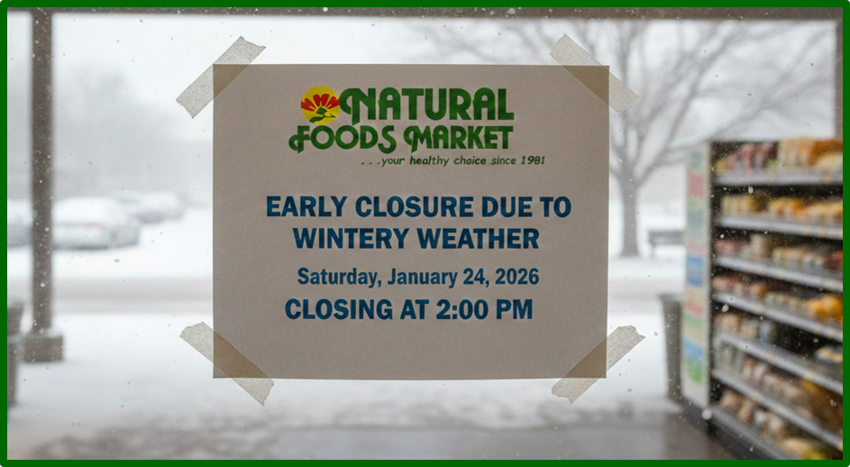 Due to wintery weather, we are closing at 2:00 pm on Saturday January 24, 2026.
