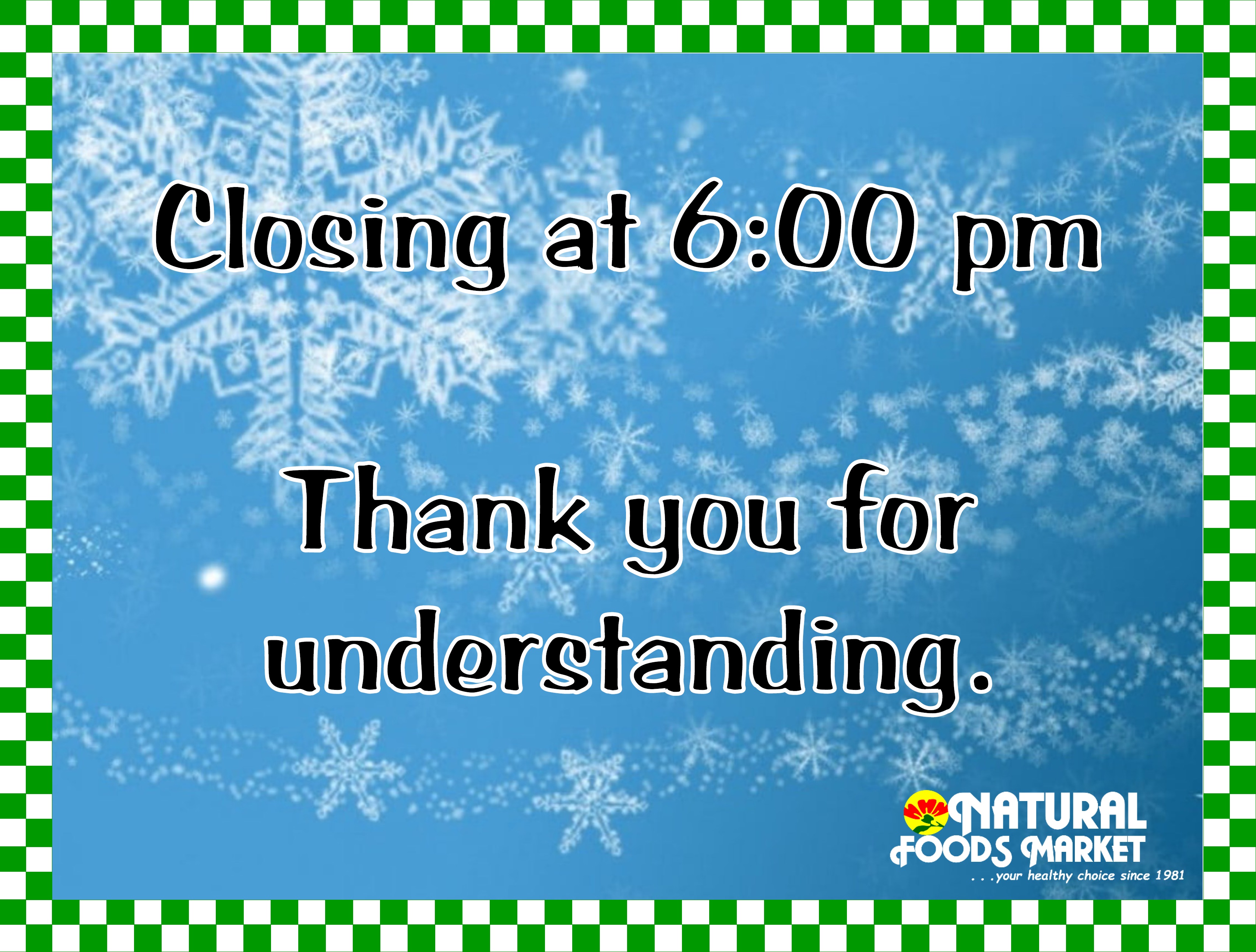 Due to wintery weather, we are closing at 6:00 pm on Friday January 30, 2026.
